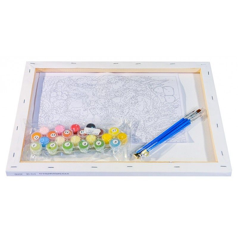 The basis of the painting is a cotton canvas stretched over a wooden subframe. A scheme is applied to the canvas, divided into areas for painting. The number inside each area indicates the number of paint to paint over the area. The kit includes water-based acrylic paints, environmentally friendly, odorless, quick-drying. The painting is painted without mixing paints. The set is equipped with special brushes of different sizes with artificial lint for acrylic paints.