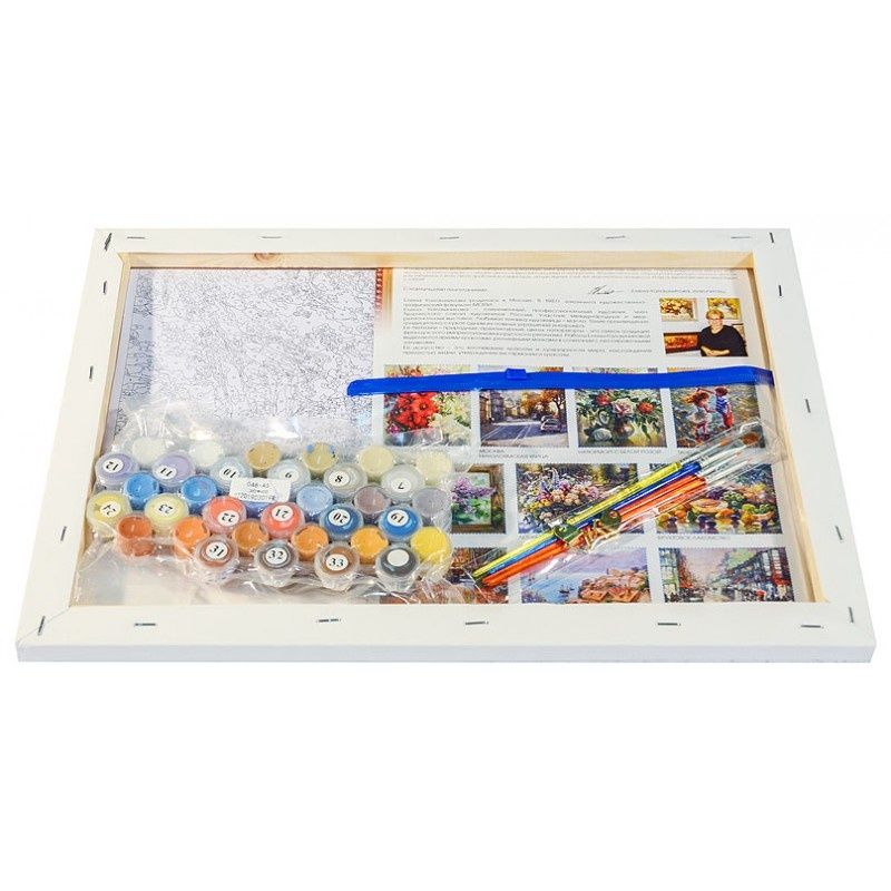 The basis of the painting is a cotton canvas stretched over a wooden subframe. A scheme is applied to the canvas, divided into areas for painting. The number inside each area indicates the number of paint to paint over the area. The kit includes water-based acrylic paints, environmentally friendly, odorless, quick-drying. The painting is painted without mixing paints. The set is equipped with special brushes of different sizes with artificial lint for acrylic paints.